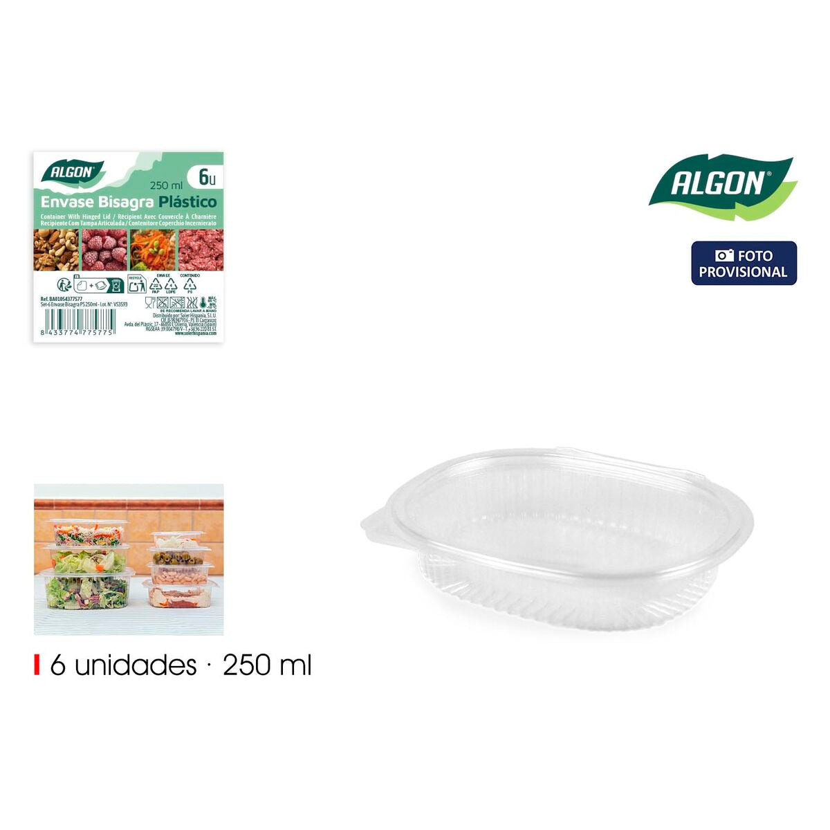 Bakker til genanvendelige fødevarer Algon OPS 250 ml 15,8 x 12,9 x 3 cm (6 Dele) (24 enheder)